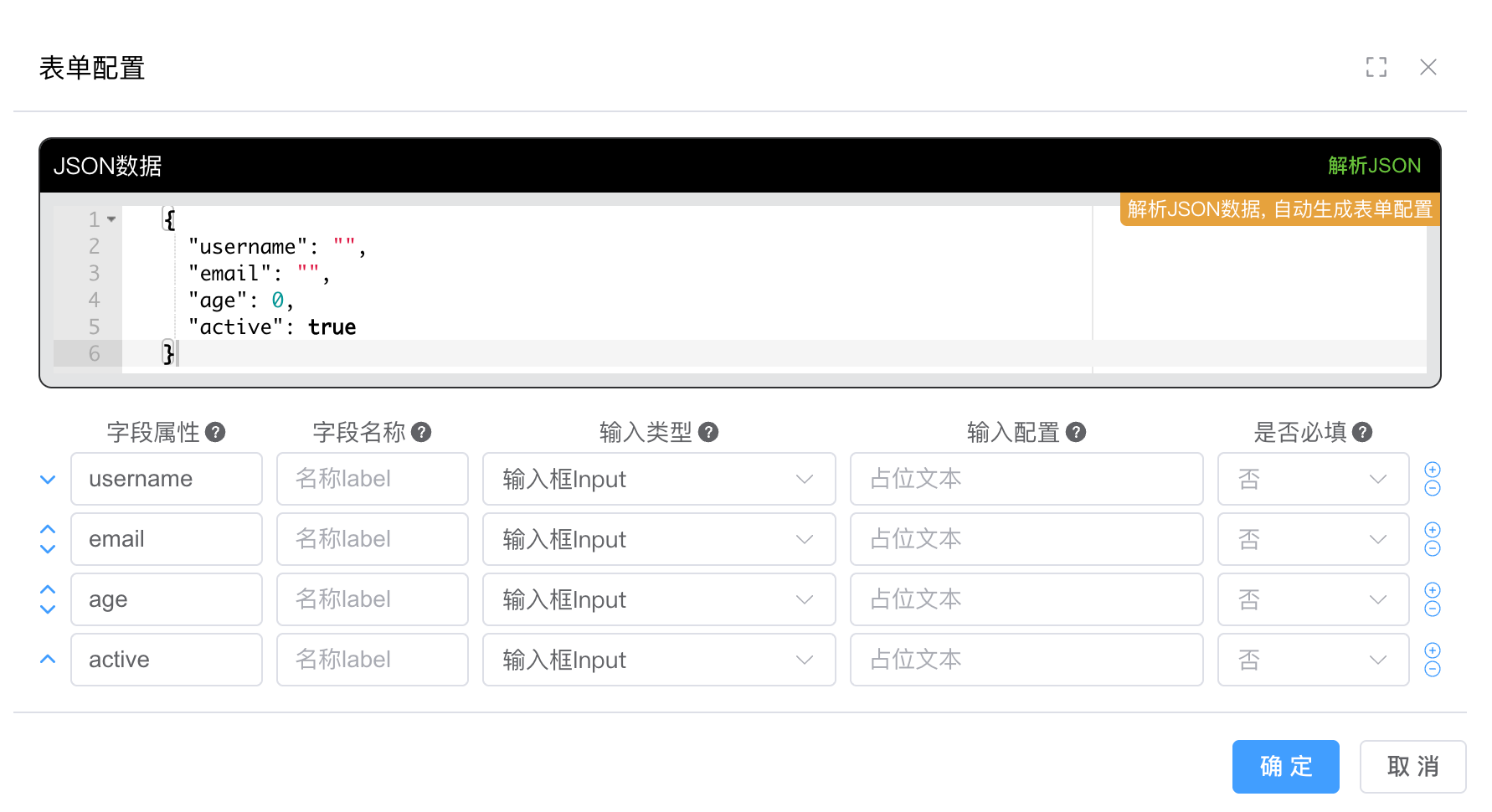 json{ "username": "", "email": "", "age": 0, "active": true }- 点击 “解析JSON” 按钮,自动识别字段