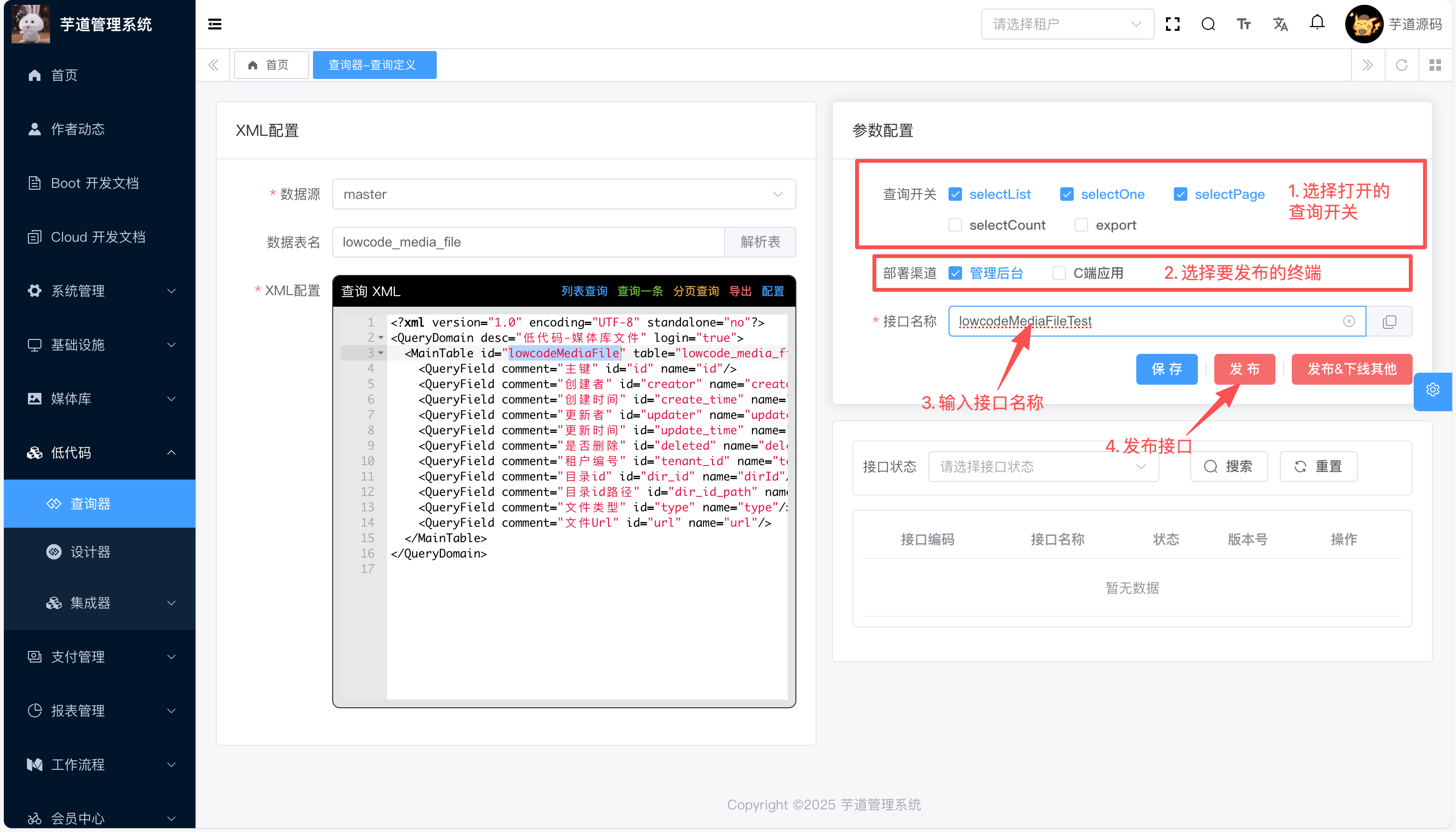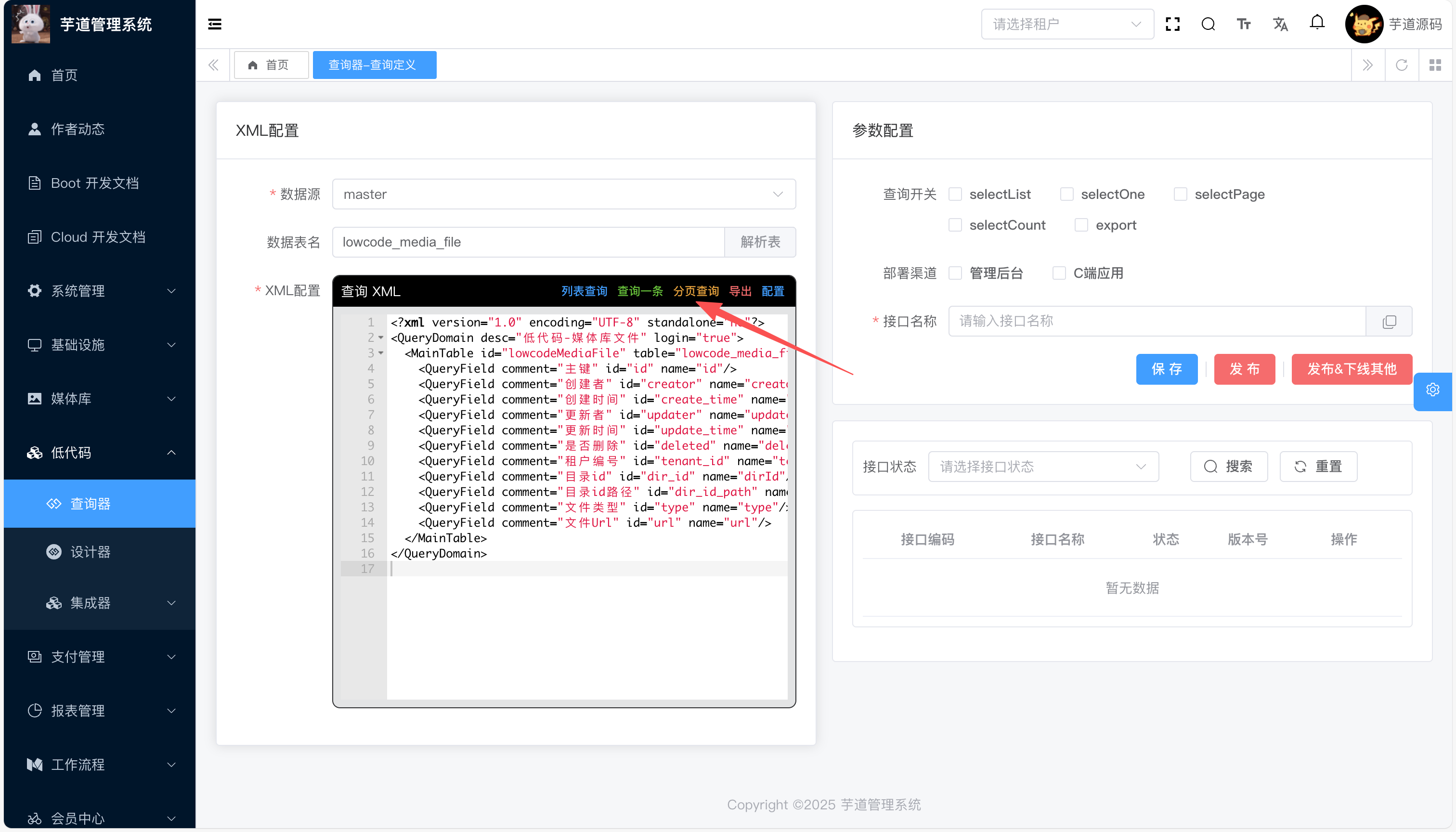 /app-api/lowcode/deploy-api/lowcodeMediaFileTest/export💡 点击 接口编码 复制, 查询时带有接口编码参数指定使用的版本